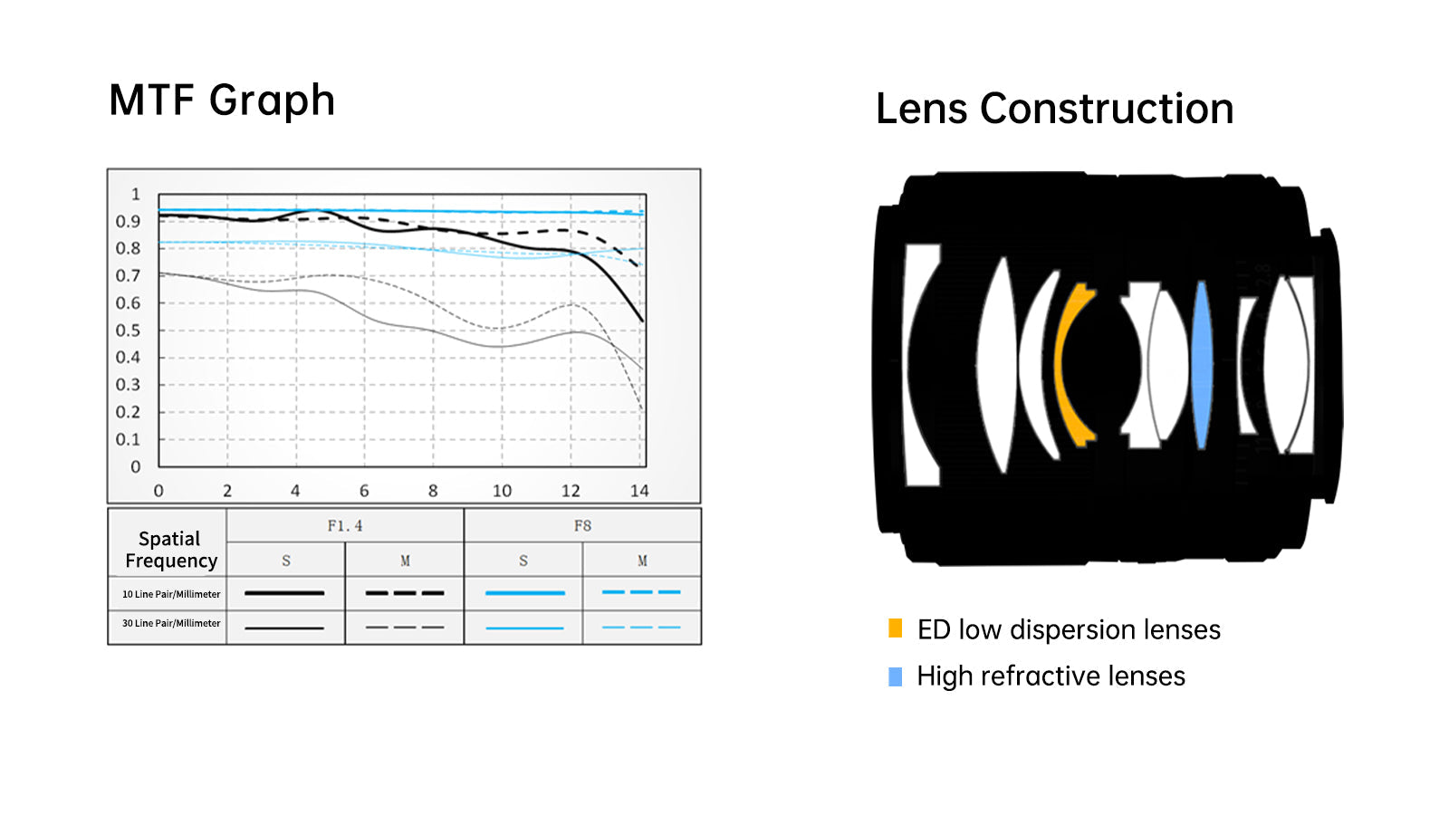 レンズ構成:9群10枚のレンズで構成され、軸上色収差を効果的に低減するED(特殊低分散)レンズを1枚採用。F1.4の開放絞りにより得られる浅い被写界深度は、被写体を際立たせる美しいボケ味を生み出します。