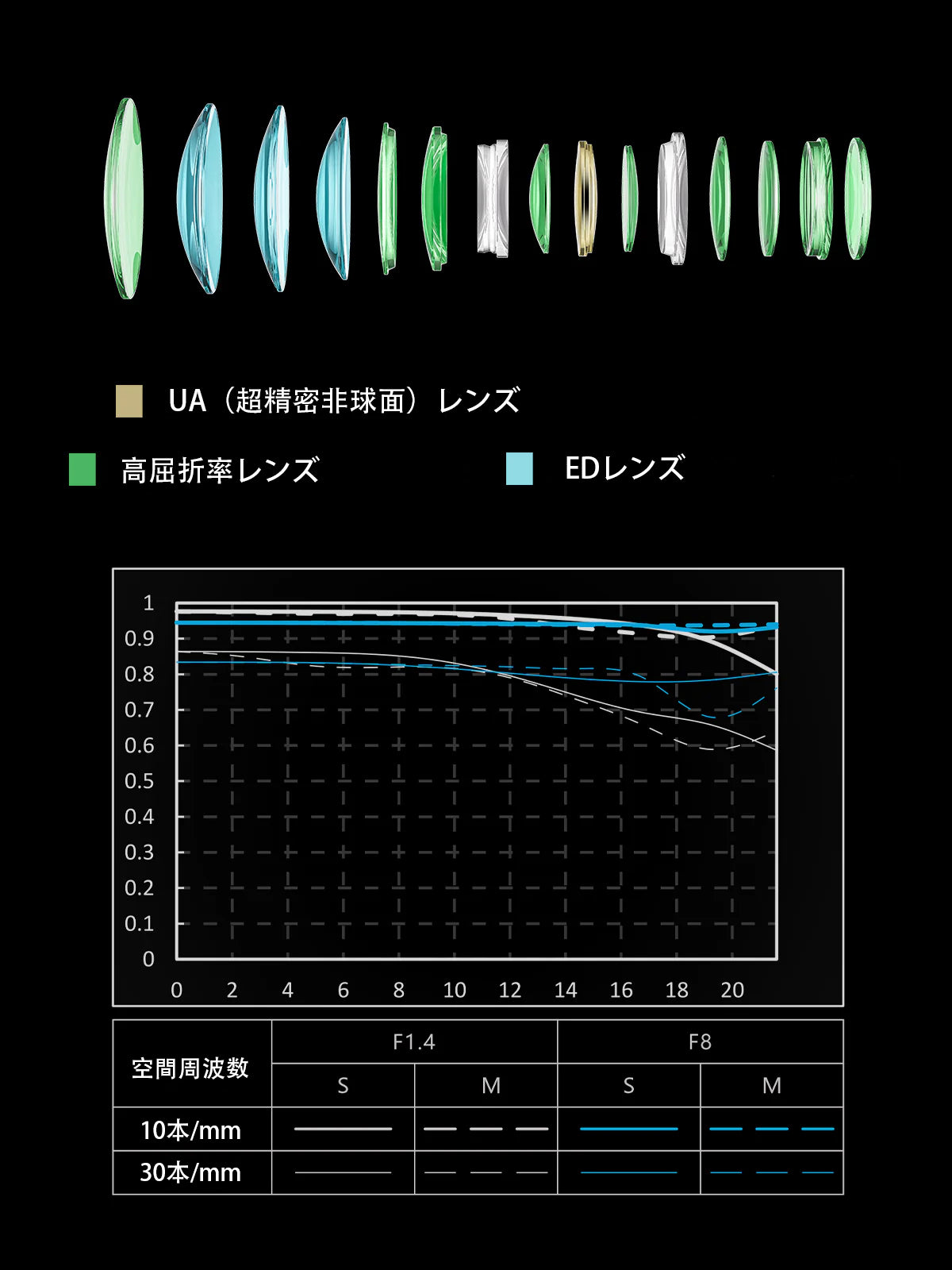 3枚のEDレンズとナノコーティングで、色収差を効果的に補正。周辺光量低下や歪曲収差を抑え、ポートレート、風景、静物撮影に最適な性能を発揮します。