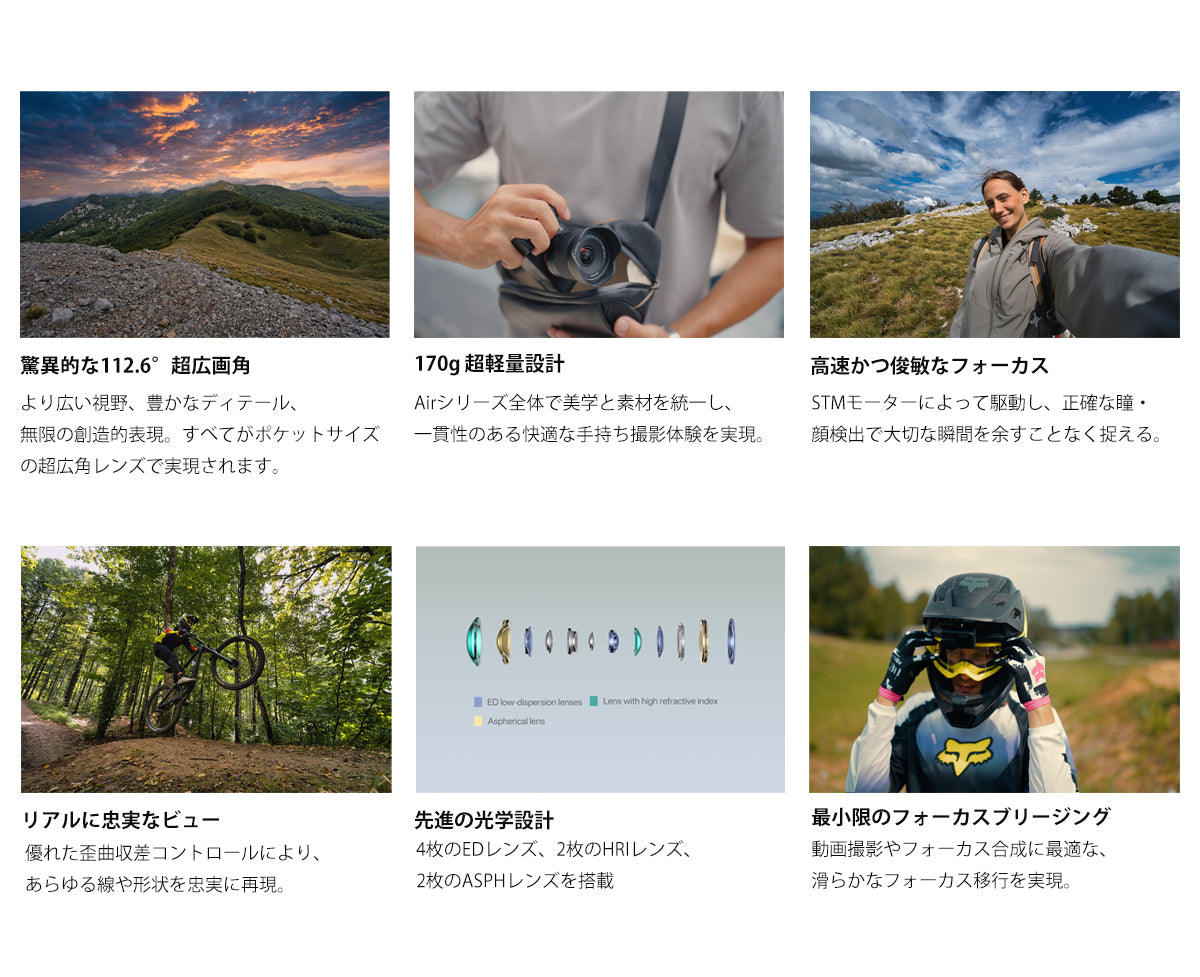 ジャケットのポケットやカメラバッグに簡単に収納できるコンパクトサイズで、エアシリーズの特徴である軽量・シンプルデザインを徹底追求しています。これにより旅行やストリートフォトグラフィーに最適なレンズとなり、クリエイターは圧倒的な広角ショットをいつでもキャプチャできます。