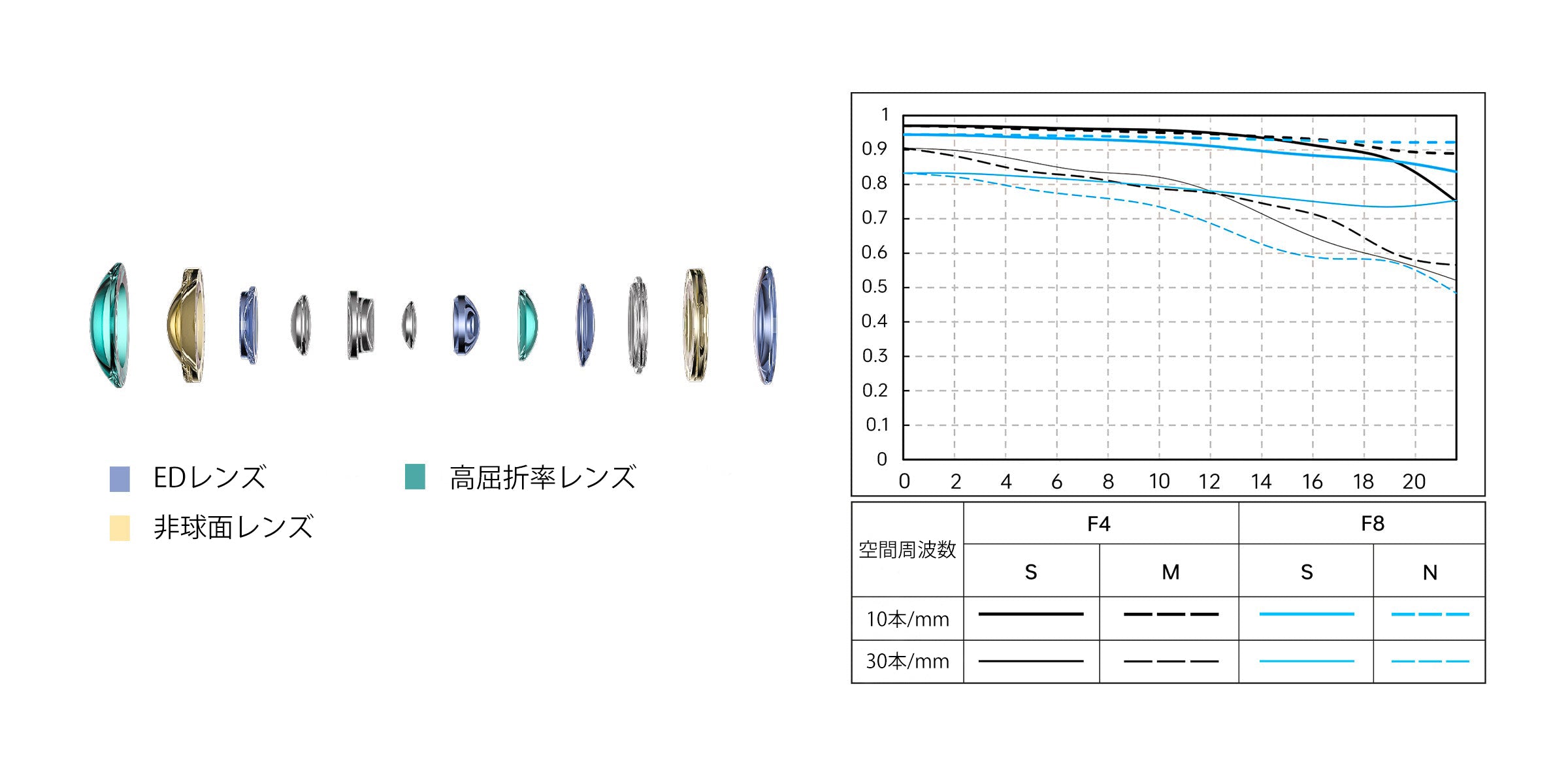 4枚のEDレンズ、非球面レンズ2枚、高屈折率レンズ2枚とナノコーティングで、色収差を効果的に補正。周辺光量低下や歪曲収差を抑え、ポートレート、風景、静物撮影に最適な性能を発揮します。